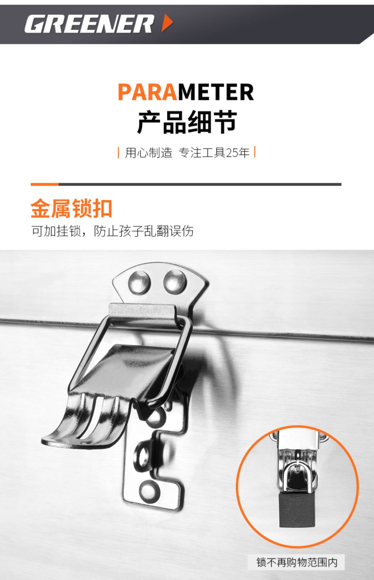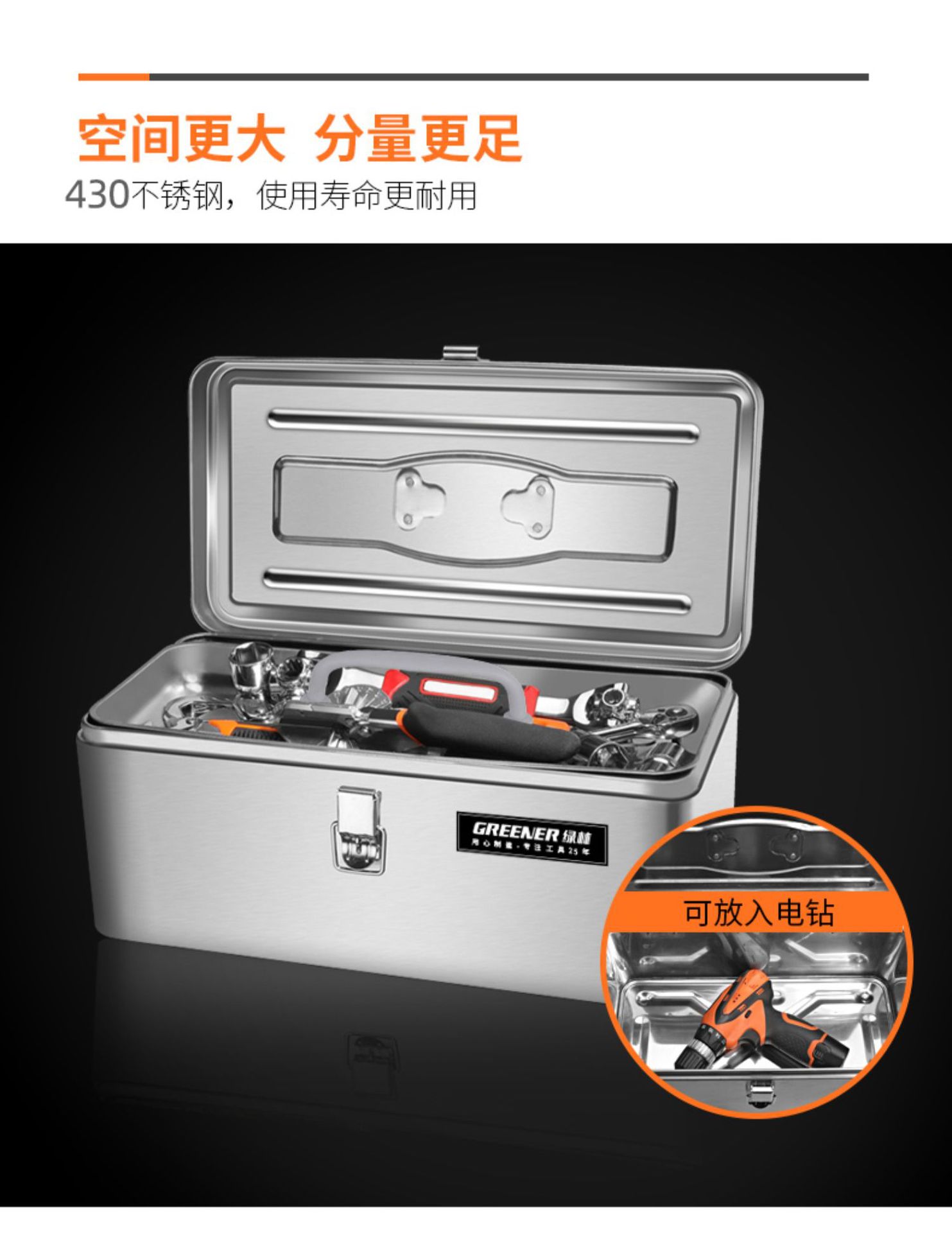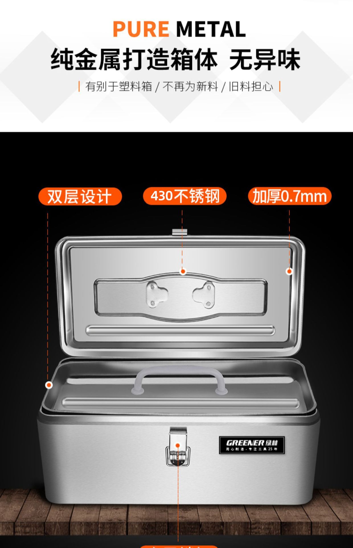 - Nombre del producto: Caja de herramientas de acero inoxidable Green Forest