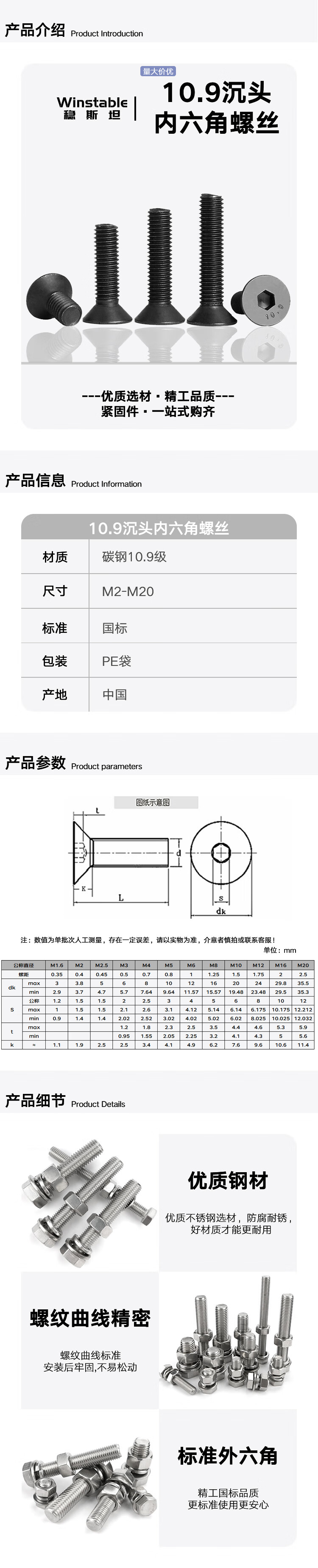 - Product Name: Winstein countersunk hexagon socket screws